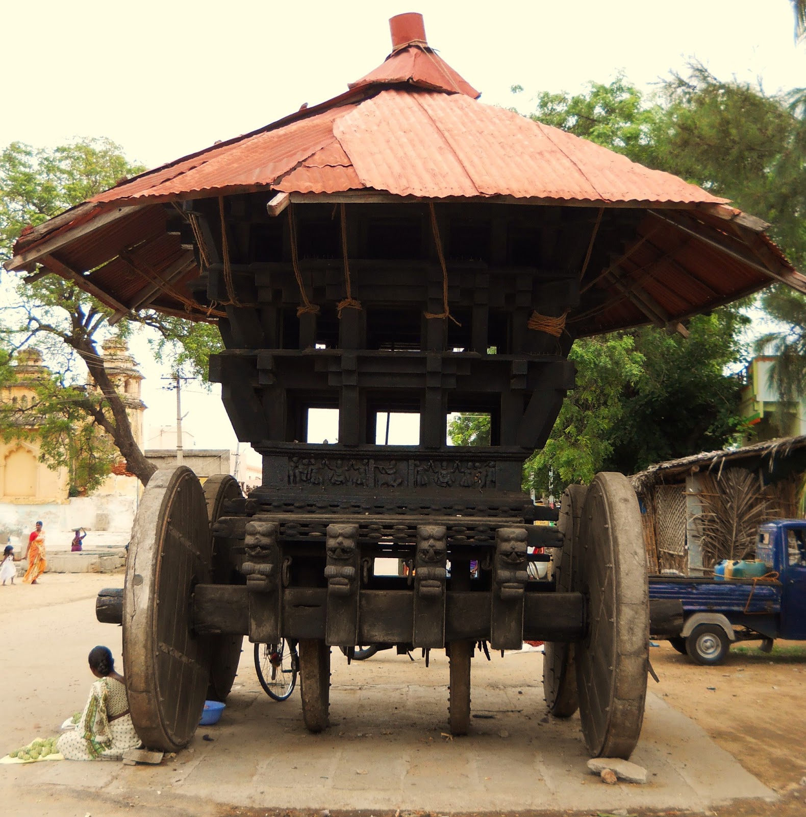 Wooden temple chariot with a corrugated metal roof and a woman selling vegetables next to one of the wheels, in the middle of Anegondi's main street. The vehicle is used for pulling an idol through the streets during festivals. Apparently the biggest celebration in Hampi is called the Virupaksha car festival, where giant representations of Shiva and his consort Pampa are carried through the main bazaar in huge, garishly decorated vehicles with much pomp and circumstance.