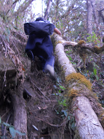 Lost in the jungle, climbing a near vertical slope. We lost out way once again, at about 8500 ft, after entering the jungle. At one point the path bifurcated, so we, logically, took the way that seemed to be going up the slope, rather than off to the left. But the path we followed soon degenerated into little more than a faint track, while the slope kept getting steeper and steeper, until we noticed that we were no longer walking, but climbing, up the side of the mountain. Luckily we found our way back to the path further up.