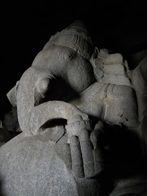 The 15 foot tall monolithic Kadalekalu Ganesha statue, in a shrine behind Hemakuta Hill. Carved out of a single granite boulder, this is one of the largest representations of Ganesha in the region. The word Kadalekalu means "Gram" in the local language, which the statue's belly is thought to resemble. In his hand, Ganesha is holding a rice cake, which he's eating with his trunk. I was surprised that this photo turned out as well as it did, given how little light there was in the shrine.